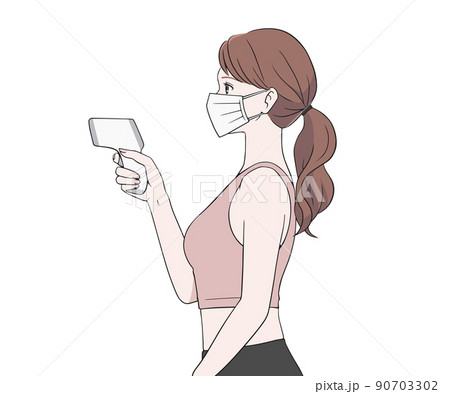 マスクをつけて検温をする横を向いたスポーツインストラクター