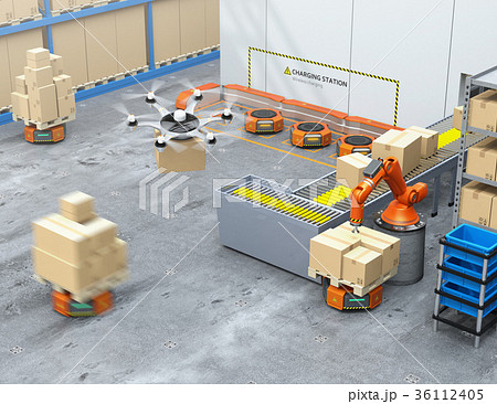 最新物流自動化装置のロボットアーム、自動運搬ロボット及びドローンの連携作業のイメージ