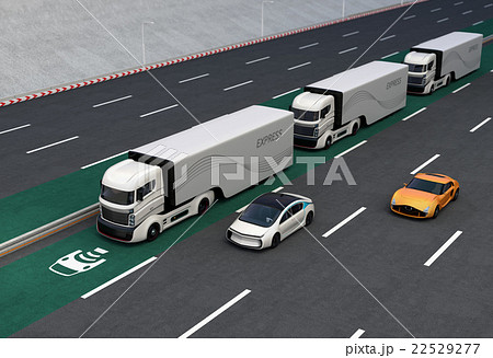 電気自動車非接触充電レーンに隊列走行している自動運転トラック