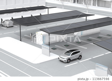 ソーラーパネル、コンテナ型蓄電システムが備えるEV充電スタンド。電力貯蔵システムのコンセプト