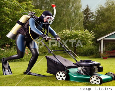 「芝刈りも冒険気分!スキューバ装備で庭仕事」