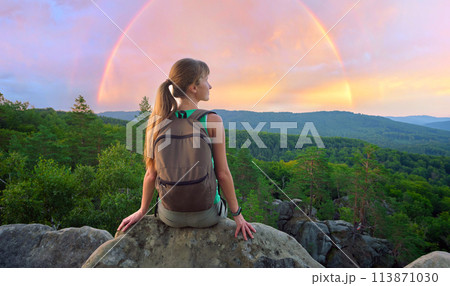 Hiker girl resting on rocky mountain top enjoying morning nature during her travel on wilderness trail. Lonely female traveler traversing high hilltop route. Healthy lifestyle concept