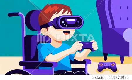 A joyful boy in a wheelchair enjoying virtual reality gaming with a controller.