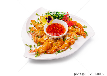 Delicious crispy shrimp served with spicy dipping sauce on white plate