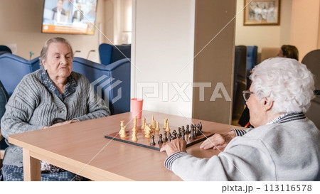 Senior woman playing chess with friend at table in nursing home