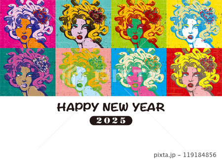 2025年賀状テンプレート「ポップアート風デザイン」ハッピーニューイヤー 英語添え書き付パターン