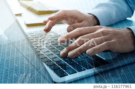 仕事でノートパソコンを使う男性の手のアップ。多数の企業高層ビル。