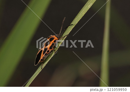 生き物 昆虫 ツマベニヒメナガカメムシ、北米原産のカメムシが南米原産のシマスズメノヒエで食事かな?