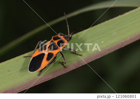 生き物 昆虫 ヒメマダラナガカメムシ、赤色に黒い模様。模様の変異は大きく前翅がほぼ黒いタイプも