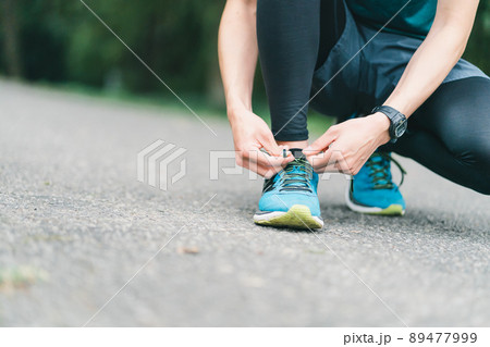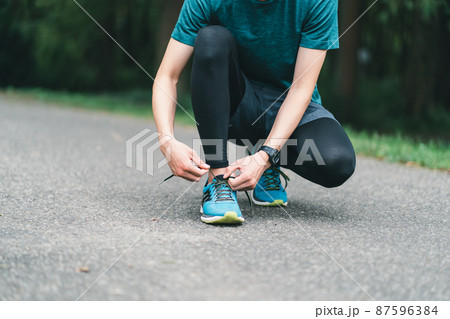 靴ひもを結ぶ女性
