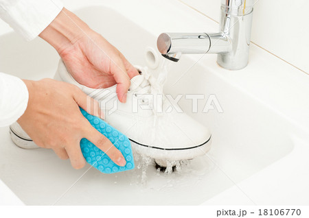 白いスニーカーとタワシ 靴洗い 靴を洗うイメージ素材