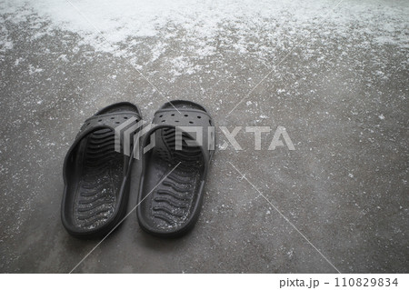 雪が積もったベランダのサンダル|冬の日常風景・生活感のある季節素材