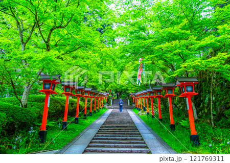 新緑の京都 鞍馬寺 九十九折り参道 石段と灯篭