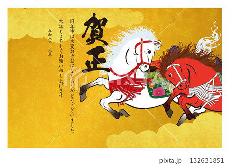 2026 午年 年賀状素材 - 装束をつけて立ち上がる馬