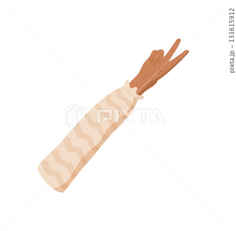 Cartoon hand with two fingers up in flat style. Gesture expresses the number 2. Arm with patterned sleeve and clothes. Isolated visual element, educational counting concept.