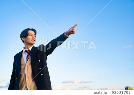 制服を着た男子高校生のポートレート 青空 空 屋外 河川敷 韓国人 カーディガン 学生服