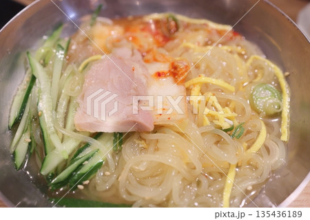 Cold and refreshing Korean naengmyeon noodles, served in a chilled broth with sliced cucumber, radish, and a boiled egg. A savory, tangy dish ideal for hot summer days.