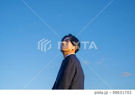 制服を着た男子高校生のポートレート 青空 空 屋外 河川敷 韓国人 カーディガン 学生服