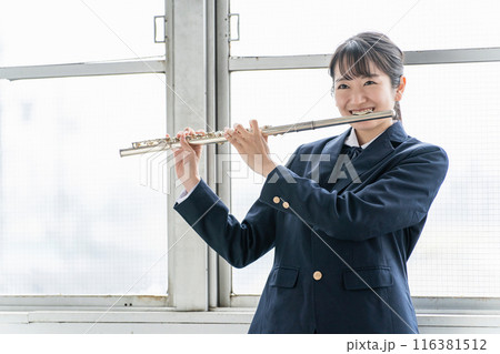 教室でフルートを吹く吹奏楽部のアジア人女子高生