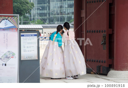 韓国ソウルの観光名所である景福宮をレンタルのチマチョゴリを着用してスマホを見ている二人組の若い女性