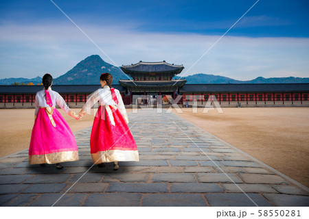韓国ソウルの観光名所である景福宮をレンタルのチマチョゴリを着用してスマホを見ている二人組の若い女性