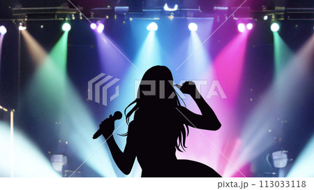 マイクを持って歌う女性アイドルシルエットとスポットライト_ワイド