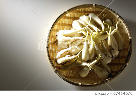 スポットライトがあたる笊の中の泥つきラッキョウ(白背景、俯瞰)
