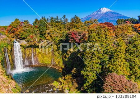 静岡県富士宮市 白糸の滝からみた紅葉と富士山