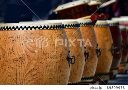 ずらりと並んだ長胴太鼓。和太鼓。和楽器。太鼓祭。イメージ素材