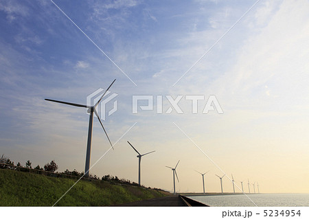 夕暮れ時の冬の響灘の風車 響灘北緑地公園 福岡県北九州市