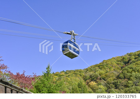 青空と雲の下、箕面山の鮮やかな紅葉。箕面公園、大阪