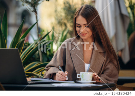 Business deals, with laptop and pen. Beautiful young woman is outdoors of the restaurant by the table