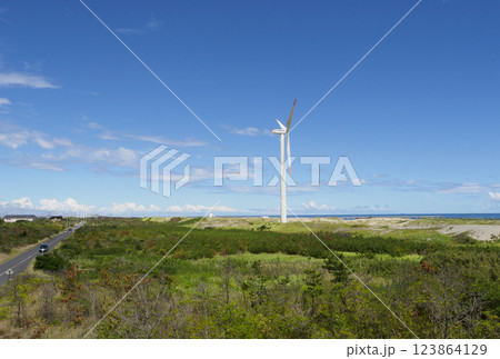 青空と海岸の風力発電の風車。茨城県神栖市須田浜海岸の波崎ウインドファーム。