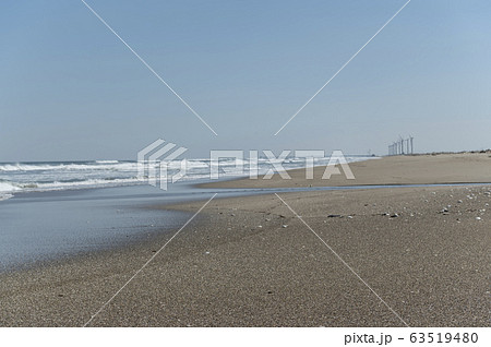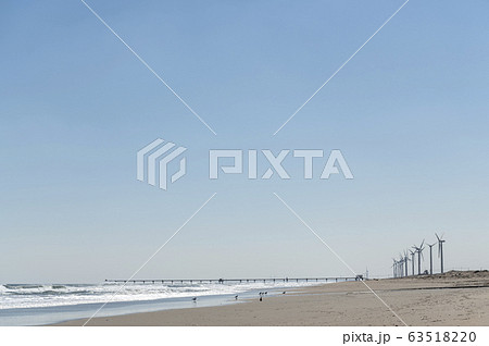 茨城県柳川海岸 浜辺から風力発電の風車の見える風景