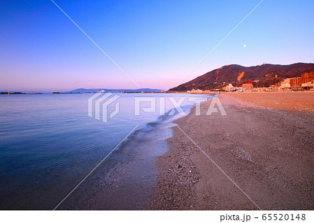 静けさ漂う朝光を浴びる須磨海岸と朝月、遠景に明石海峡大橋、淡路島