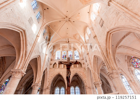 white Buddhist statue of Buddha sitting on a lion in park at the Linh Ung Pagoda in Da Nang in Vietnam in summer in Asia
