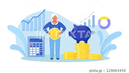 Elderly man standing near stack of money, piggy bank holding gold coin. Pensioner keeping cash in bank deposit account. Pension savings investment in retirement mutual fund. Financial saving insurance