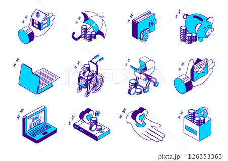 Social security concept 3d isometric icons set for web isometry design. Collection elements of mortgage home, insurance protection for money savings, disability, childbirth, more. Vector illustration.
