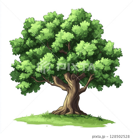 A vibrant, full-grown oak tree with dense green foliage and a sturdy brown trunk stands on a patch of grass against a clean white background.