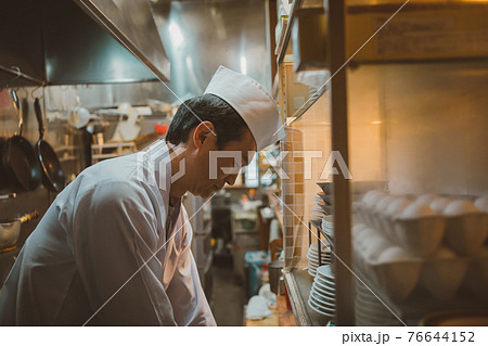 飲食店の厨房でコック服を着たシニア男性が料理を作る
