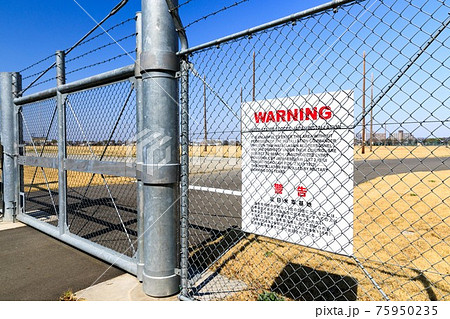 埼玉県 米軍所沢通信基地ネットフェンス門扉の警告板と青空