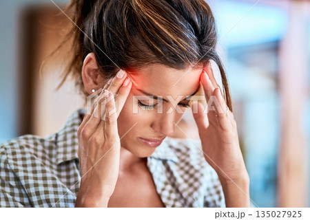 Headache, woman and hands on head for pain, stress and burnout or brain fog or temple massage for anxiety, fatigue or hurt. Person, migraine or mental health problem with sore or vertigo overlay