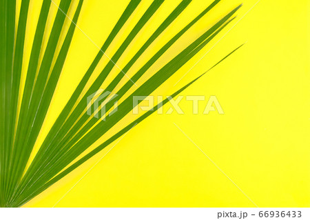 Green tropical palm leave on bright yellow background. Minimal summer concept. Creative flat lay.