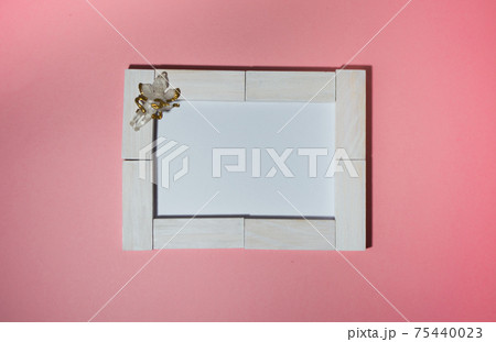 Christmas holidays composition, top view pink-purple-violet Christmas decorations on white-blue background with copy space for text. Flat lay. Winter, postcard template