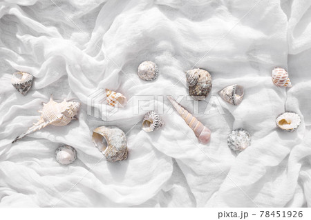 Colorful seashells on light white fabric. Travel, vacation summertime concept. Minimal summer sea background.