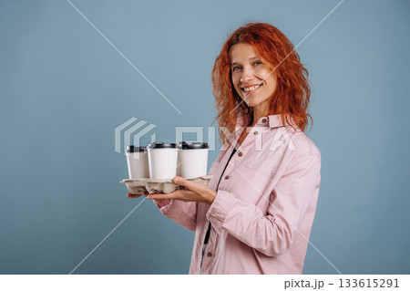 Chambermaid is standing. Young pretty woman is against background in the studio