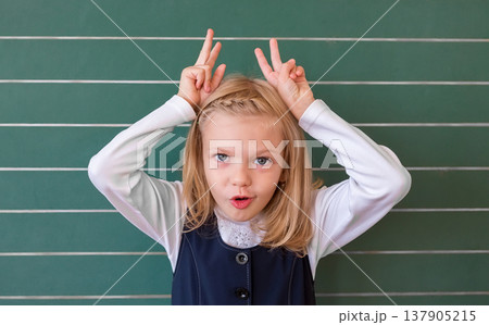 First grade pupil a girl writing on green blackboard at school lesson