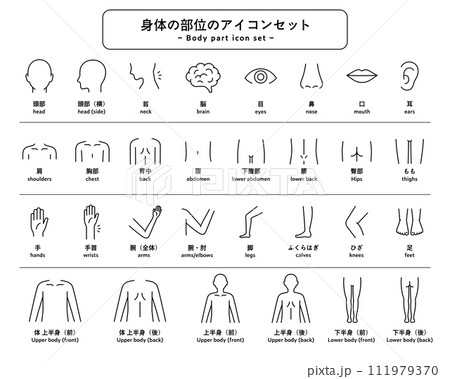 体(身体)の部位のアイコンセット パーツ 人体 ピクトグラム 健康 上半身 下半身 マッサージ 医療