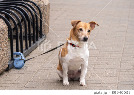 The little dog is waiting for its owner. The dog is tied up at the entrance to the store. The animal is shivering from the cold and carefully looks at the exit from the store