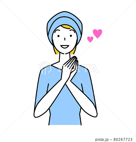 ヘアケア 薄毛対策で医療用のお洒落なケア帽子をかぶっている笑顔の可愛い女性 イラスト シンプル
